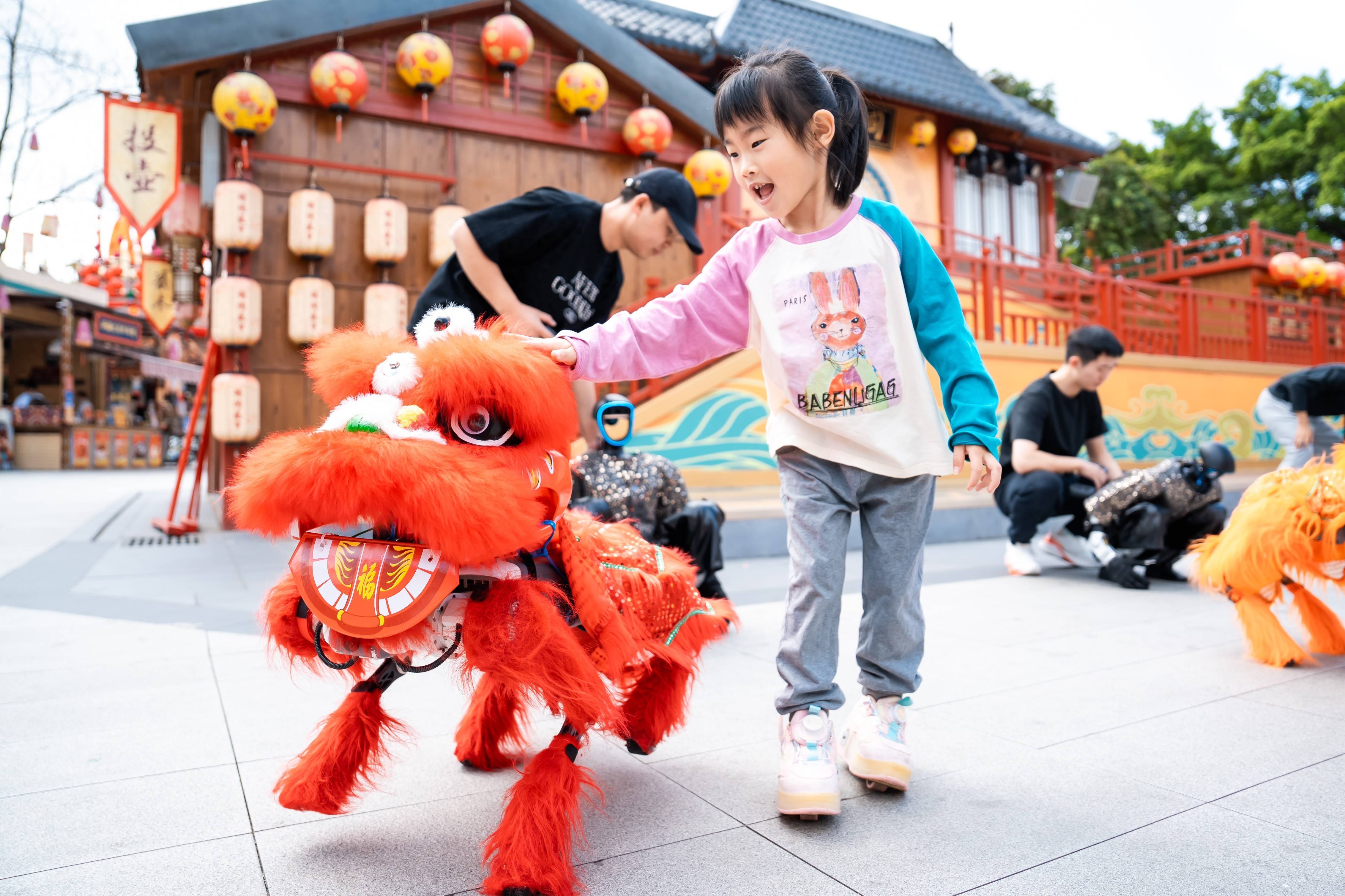 全新亮相的《翠湖幻境》成为爆款。2万平方米水域之上,火壶钢花绚烂绽放,百米水上长龙蜿蜒盘旋,激光与威亚交织,侗族大歌与傩舞同台。这不仅是视觉盛宴,更是传统非遗在现代科技加持下的极致表达。与此同时,“印象中国·非遗京剧沉浸街区”让国粹走出戏台,与游客零距离互动;春晚同款机器人、机器狗加盟《非遗社火闹新春》,与英歌舞、鱼龙舞同场竞技,传统与现代的“碰撞”引得现场欢笑与喝彩不断。